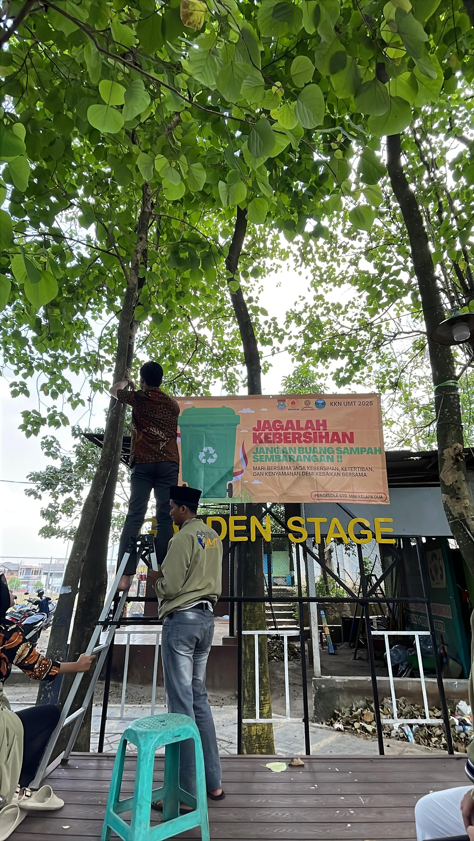 Kegiatan ini dilaksanakan pada Rabu, 30 Juli 2025 di Studio Mini Kelapa Dua dan Taman Jati Hijau. Banner berisi pesan kebersihan, larangan parkir, dan penandaan Mushola Jati Wangi. Desain dibuat jelas dan menarik agar mudah dibaca dan dipahami warga.