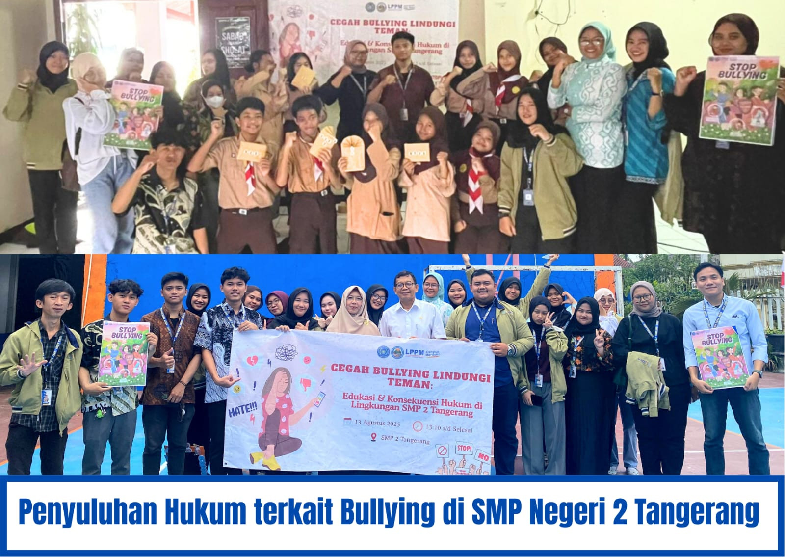 Kegiatan ini bertujuan untuk memberikan edukasi kepada Siswa/Siswi SMP Negeri 2 Tangerang mengenai cara menghadapi dan menangani tindakan bullying, baik terhadap diri sendiri maupun orang lain. Kesadaran hukum terkait bullying perlu ditanamkan sejak dini agar tercipta lingkungan belajar yang aman dan sehat. Sasaran kegiatan ini meliputi perwakilan siswa kelas 7, 8, dan 9, para guru SMP Negeri 2 Tangerang, serta Mahasiswa KKN Suka Asih sebagai pelaksana kegiatan tersebut.